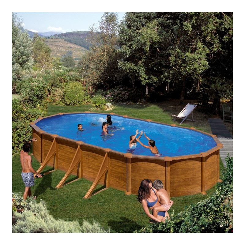 Piscina de acero elevada imitación madera modelo MAURITIUS de la marca GRE se instala fácilmente sin necesidad de realizar trabajos de excavación. Este modelo se acopla a cualquier lugar gracias a su durabilidad y esta disponible en forma redonda de 500x300 cm 132 cm, 610x375 cm 132 cm y 730x375 cm 132 cm.