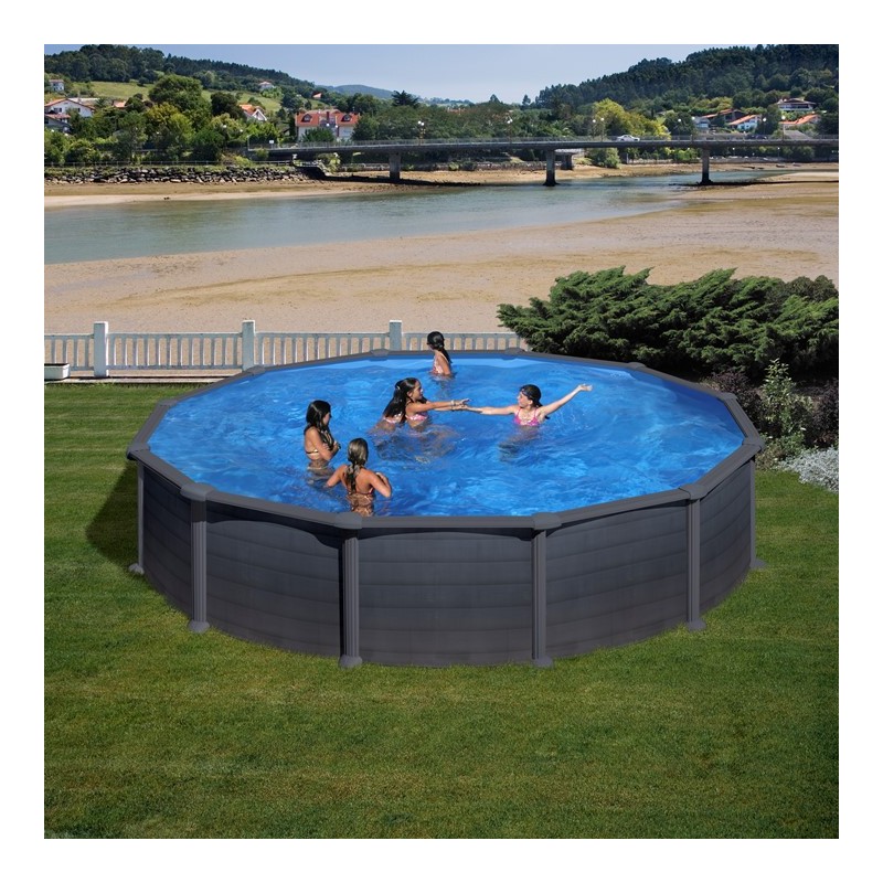La piscina de acero con aspecto grafito GRANADA puede instalarse fácilmente sin necesidad de realizar trabajos de excavación, se acopla a cualquier lugar gracias a su gran durabilidad y versatilidad, disponible en forma redonda: Ø350 cm 132 cm, Ø460 cm 132 cm, Ø550 cm 132 cm y oval: 500x300 cm 132 cm, 610x375 cm 132 cm y 730x375 cm 132 cm.