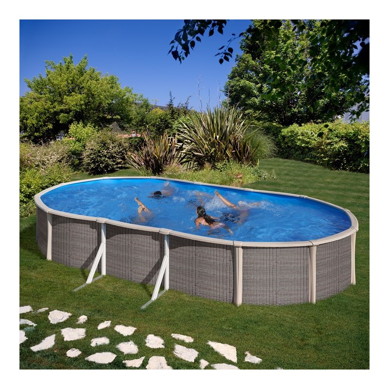 • Es una piscina OVAL de pared de acero con aspecto ratán y postes laterales.