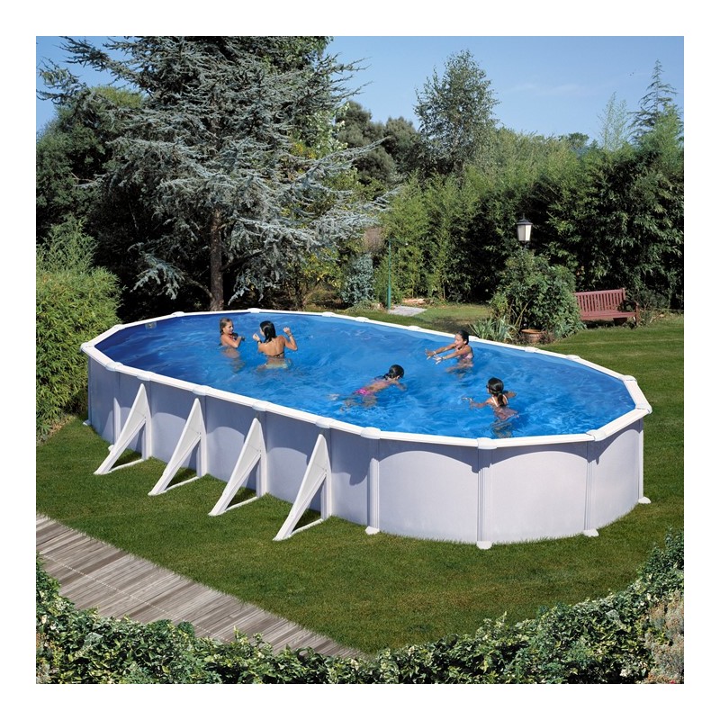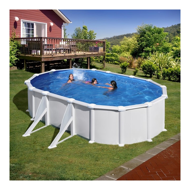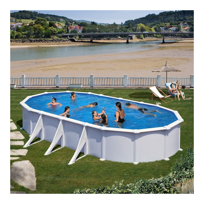 Piscina elevada de acero blanco serie ATLANTIS marca GRE en forma oval, disponible en varios tamaños desde 500x300x132 cms hasta 1000x550x132 cms con filtro de arena de 5/7/8 y 10m3/h, escalera de seguridad con plataforma + 2x3 peldaños y tapiz protector.