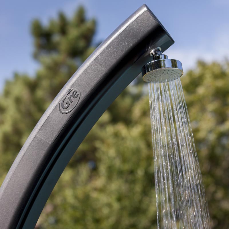 GRE propone una amplia gama de duchas solares de distintos colores, con lavapiés o sin y con un tanques que van desde los 20 litros hasta los 35 litros.