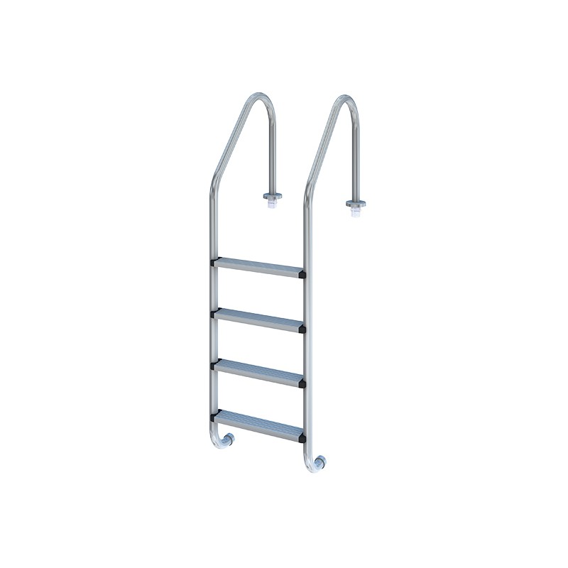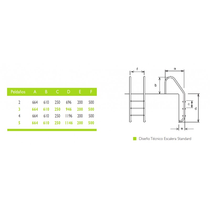 Escalera estándar fabricada en acero inoxidable, con peldaños antideslizantes. Indicada para usarse en piscinas enterradas con sistema de cloración salina. Incluye anclajes y tapetas.