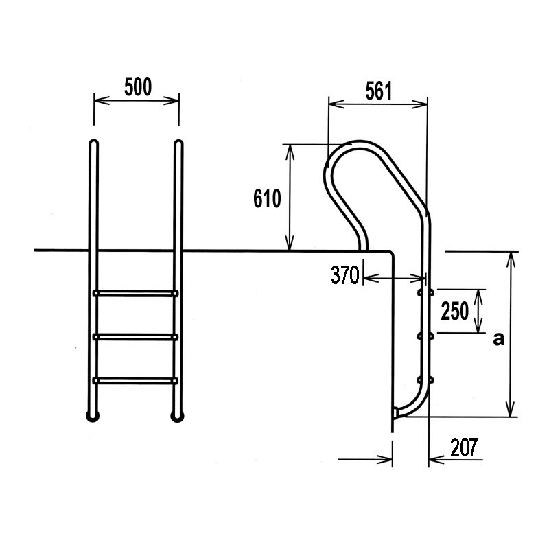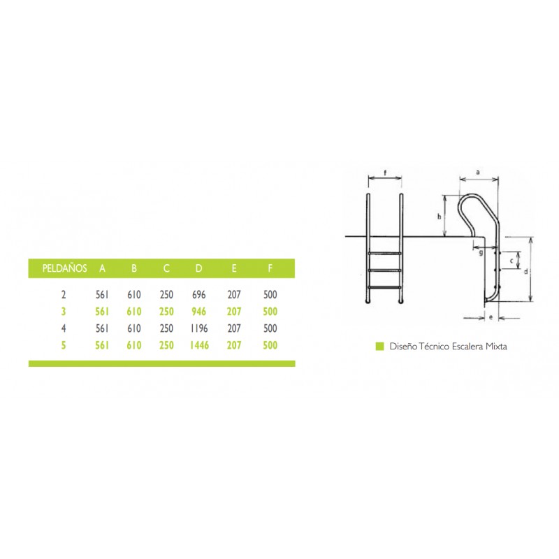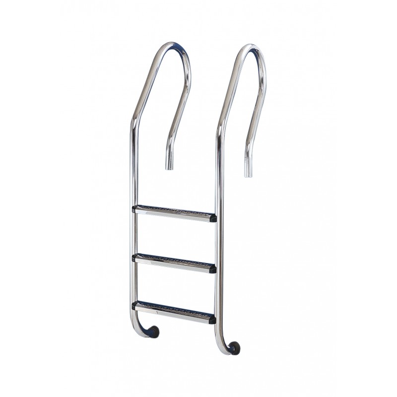 Escalera de acceso para piscinas, fabricada en acero inoxidable con peldaños antideslizantes, indicada para piscinas enterradas.