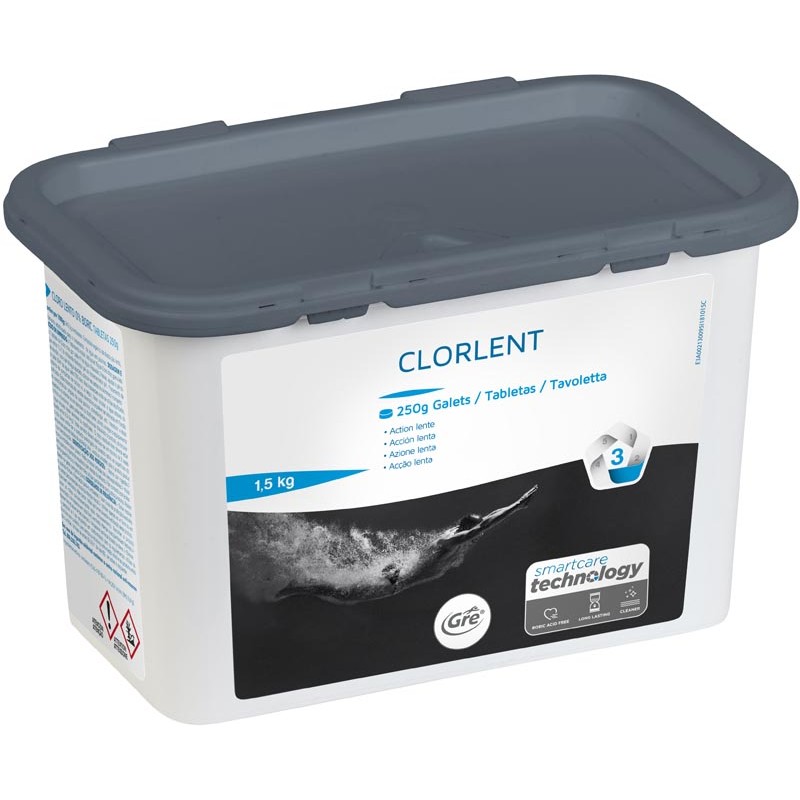 Existen dos categorías de cloro: el cloro de choque para realizar un tratamiento de choque y abrir la piscina después de una temporada sin uso, y el cloro lento para el mantenimiento diario del agua de la piscina. La gama GRE dispone de varios formatos de cloro: granulado, tabletas o líquido para cubrir todas las necesidades de tratamiento de la piscina.