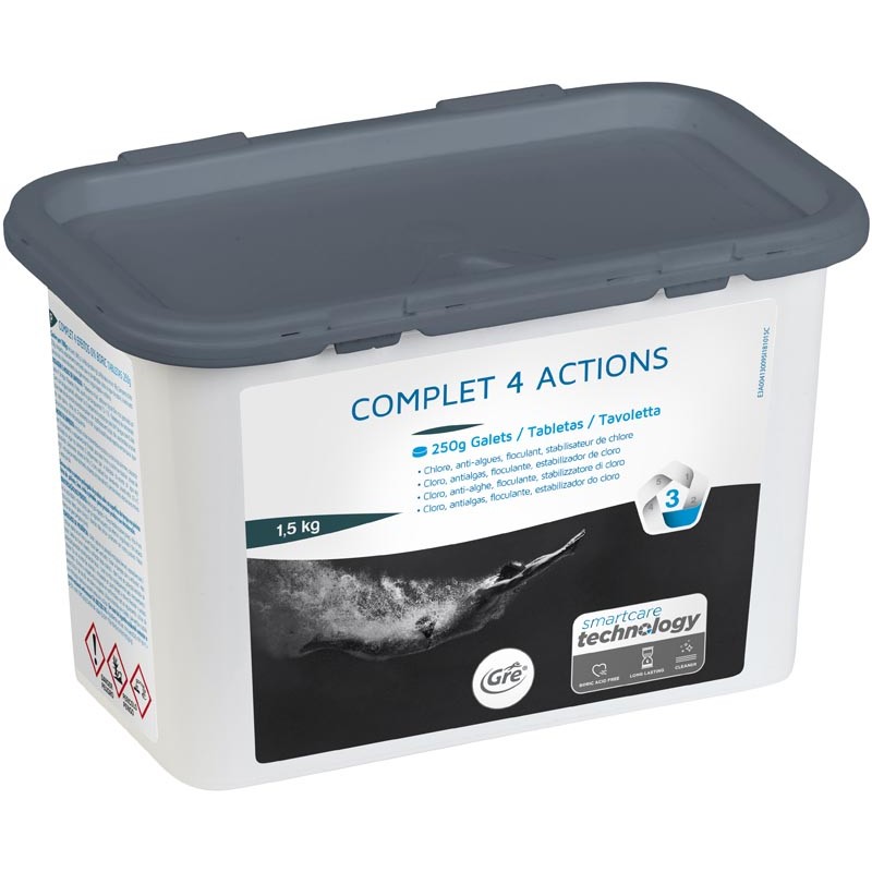 Los componentes químicos de estas gamas de productos son varios: cloro lento, cloro choque, anti-algas, anti-cal y floculante. Una sola dosis de este producto, permite tratar la piscina en profundidad y tener una agua cristalina.