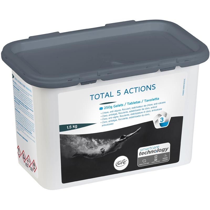 Los componentes químicos de estas gamas de productos son varios: cloro lento, cloro choque, anti-algas, anti-cal y floculante. Una sola dosis de este producto, permite tratar la piscina en profundidad y tener una agua cristalina.