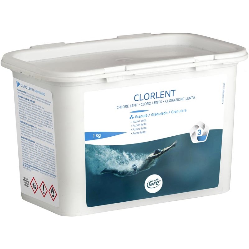 Existen dos categorías de cloro: el cloro de choque para realizar un tratamiento de choque y abrir la piscina después de una temporada sin uso, y el cloro lento para el mantenimiento diario del agua de la piscina. La gama GRE dispone de varios formatos de cloro: granulado, tabletas o líquido para cubrir todas las necesidades de tratamiento de la piscina.
