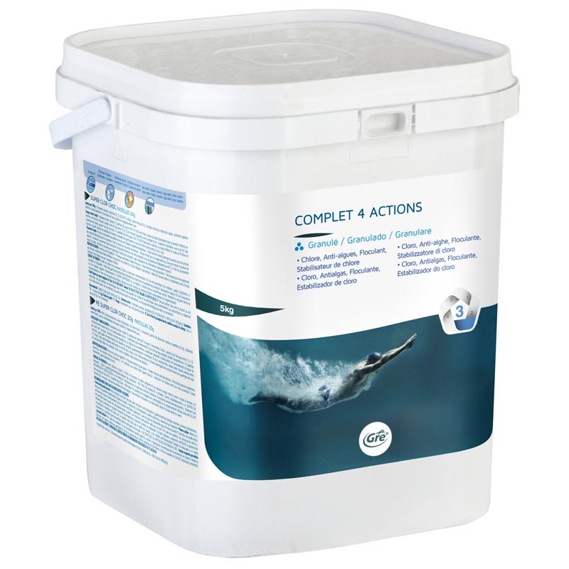 Los componentes químicos de estas gamas de productos son varios: cloro lento, cloro choque, anti-algas, anti-cal y floculante. Una sola dosis de este producto, permite tratar la piscina en profundidad y tener una agua cristalina.