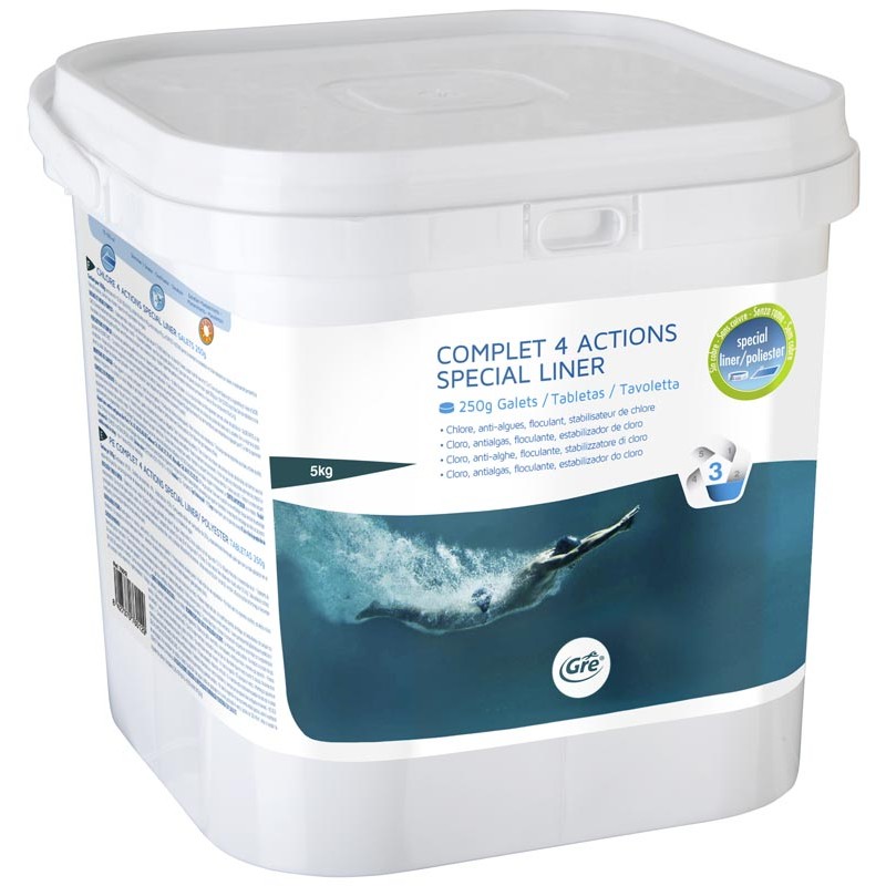 Los componentes químicos de estas gamas de productos son varios: cloro lento, cloro choque, anti-algas, anti-cal y floculante. Una sola dosis de este producto, permite tratar la piscina en profundidad y tener una agua cristalina.